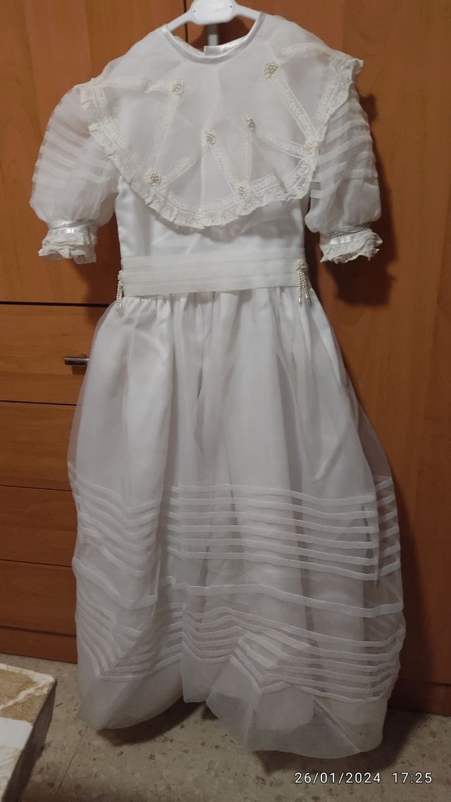 Traje de comunión para niña en Blanco, de encajes en mangas cortas. Regalo limosnera, guantes de encaje y aplique para el pelo. en caja original.