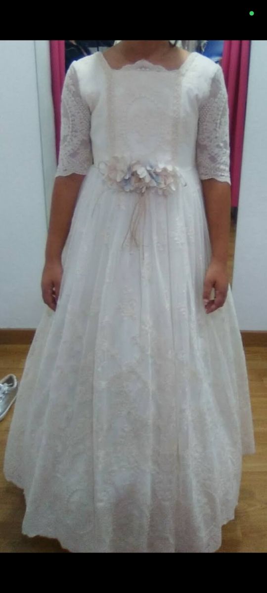 Precioso traje de comunión para niña, con detalles de encaje y flores en la cintura. - Diseño elegante y delicado. - Incluye pasador de pelo a juego.