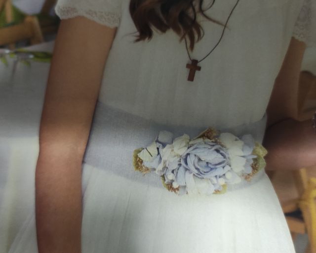 Vestido de comunión blanco muy elegante, con decoración floral en el pelo en tonos azules. Precioso lazo grande en color azul.