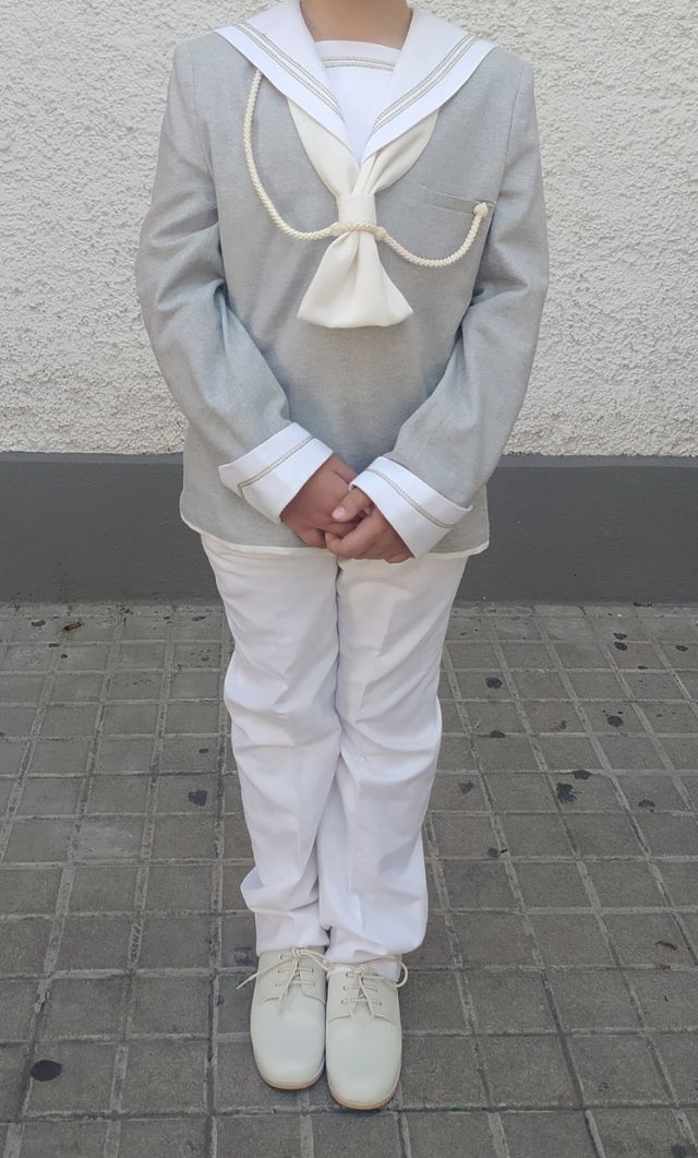 Traje comunión niño talla 11, para niño grandecito. Sólo puesto para el día de la comunión. En la foto el pantalón se ve blanco, pero es crudo, igual que la casaca.
