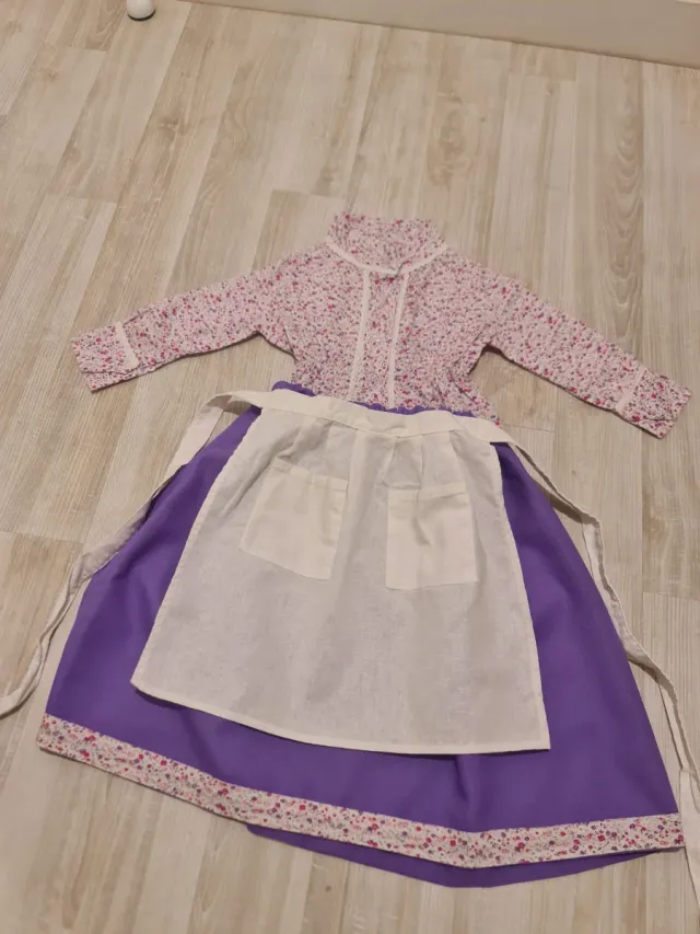 Detalles del productoConjunto de traje de casera en muy buen estado. En tonos lilas y rosas super bonito. Compuesto por blusa, falda y delantal.