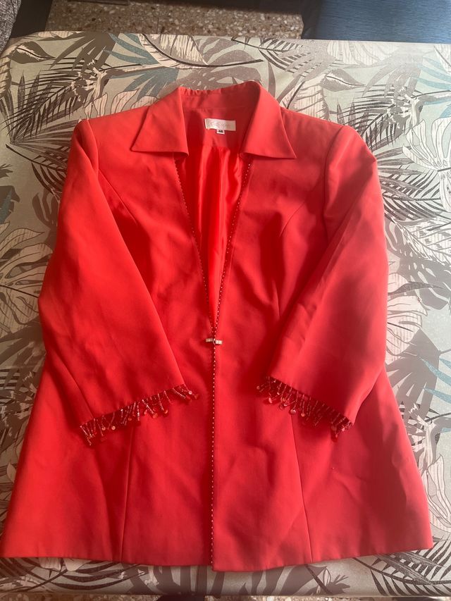 Elegante traje de chaqueta para mujer en color rojo vibrante. Ideal para ocasiones especiales o para añadir un toque de sofisticación a tu vestuario.