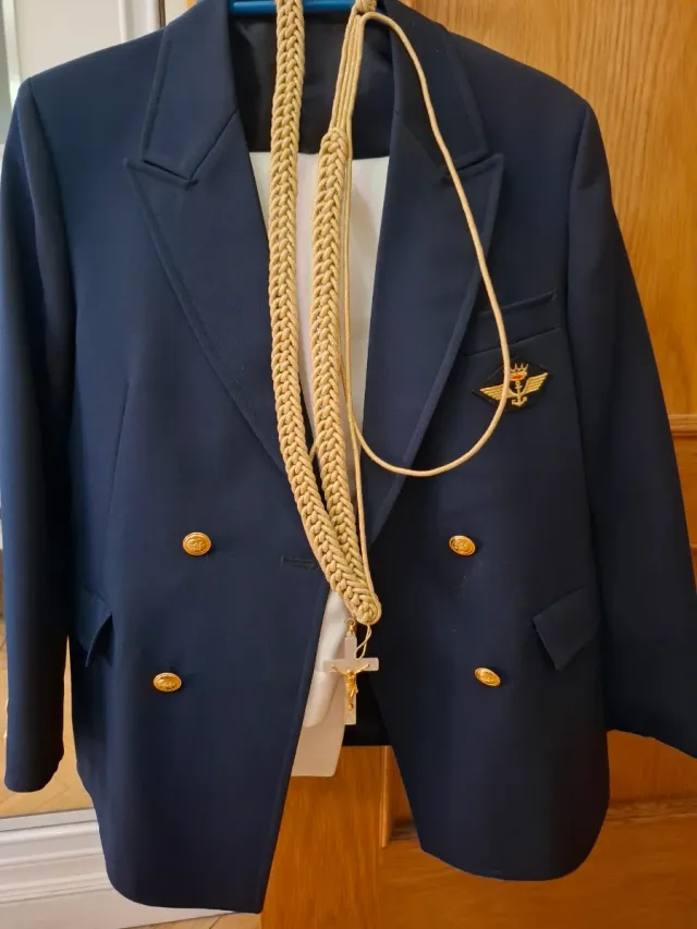 Traje de comunión completo, ideal para la ceremonia. - Chaqueta azul de doble abotonadura. - Cordón dorado trenzado con cruz. - Insignia dorada en la solapa.