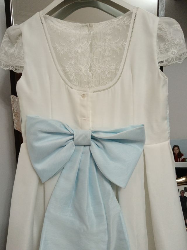 - Gran lazo de tela en color azul celeste en la parte trasera.