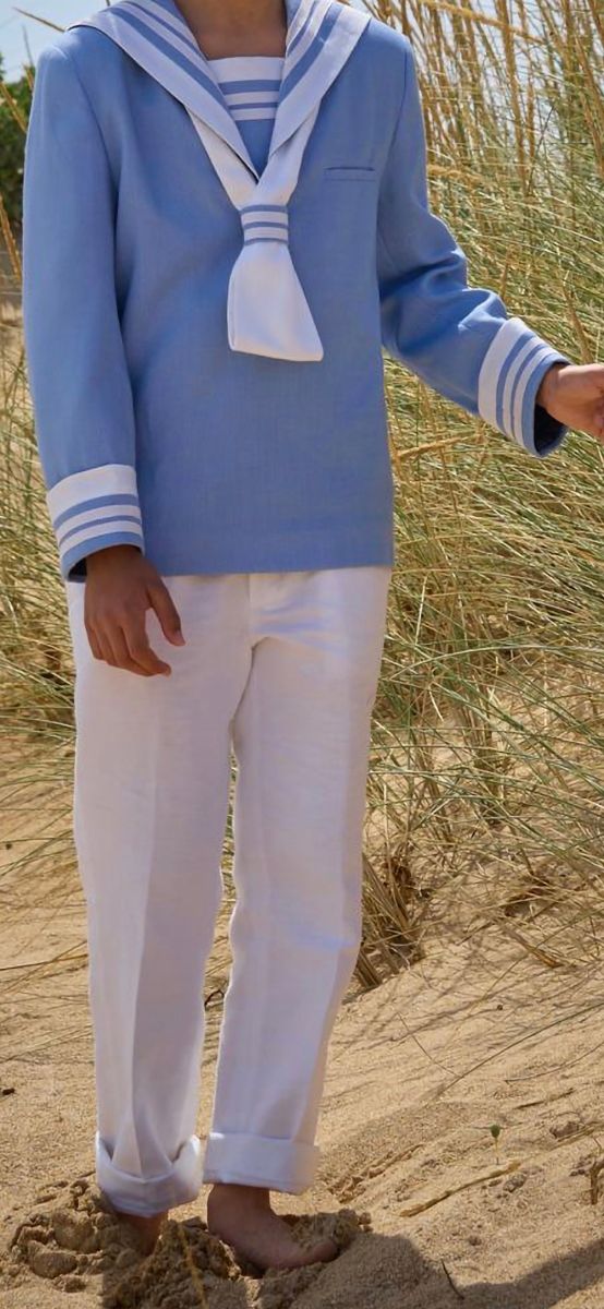 Detalles del productoTraje de comunión de estilo marinero para niño. Compuesto por chaqueta azul y pantalón blanco. Talla 9-10 años, marca Coconut.