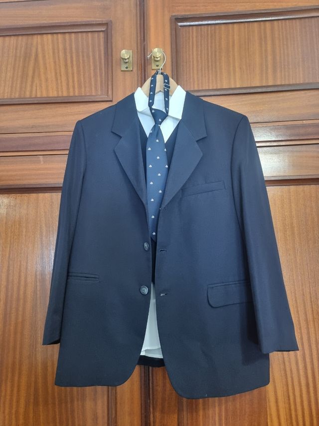 Comprado en "El Corte Inglés" Corbata con clip, Chaqueta y chaleco talla 22, camisa blanca talla 35, pantalón talla 20