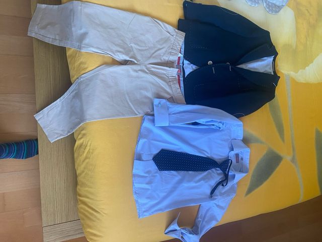 Detalles del productoConjunto de traje para niño, ideal para eventos especiales como comuniones. Incluye chaqueta, pantalón, camisa y corbata.
