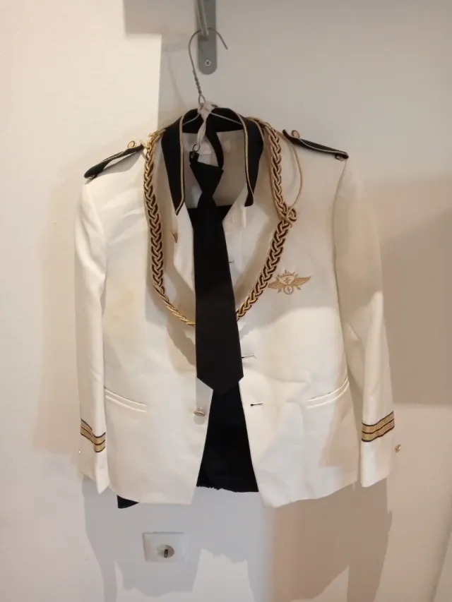 - Chaqueta blanca con detalles dorados.