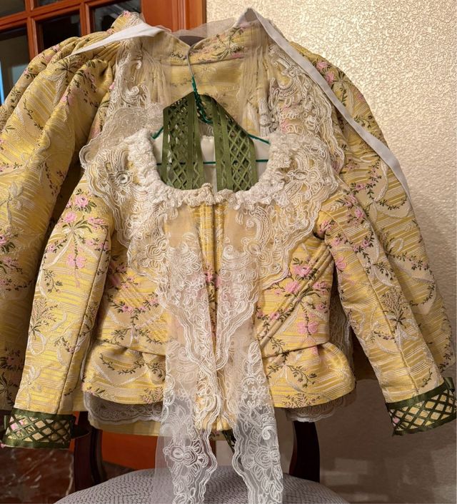 Traje de fallera de tela brocada en tonos amarillos con detalles florales en rosa. Incluye manteletas y delantal.