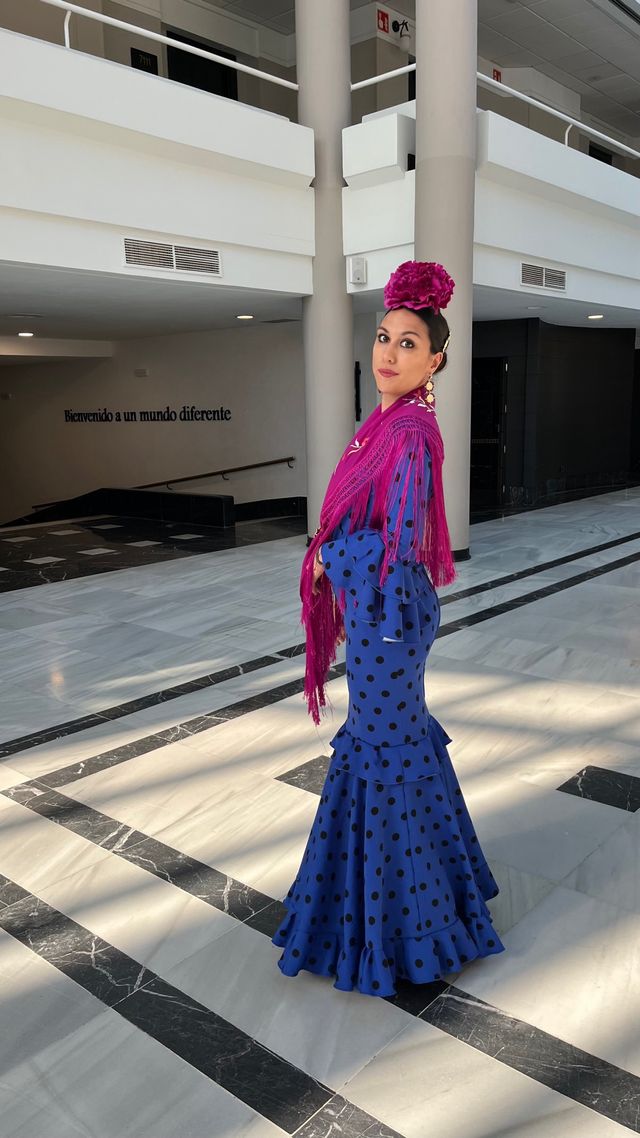 Traje de flamenca azul con lunares negros.
