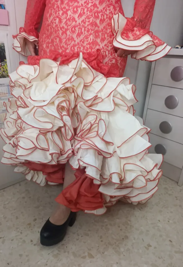 Traje de flamenca coral y beis