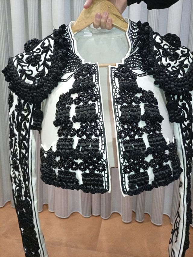 Traje de luces blanco y azabache, chaleco en plata para uñas medidas de 1'70 de alto y 65 kilos.