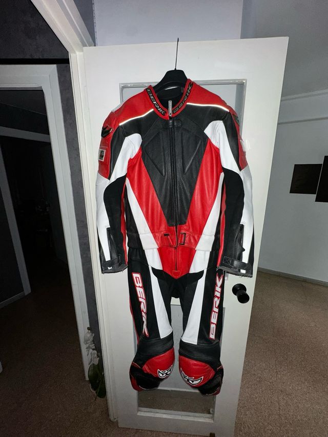 Detalles del productoTraje de moto de 2 pieza de la marca Berik totalmente nuevo puesto solamente 2 veces como se puede apreciar en las fotos talla M diseñado para un estilo deportivo.
