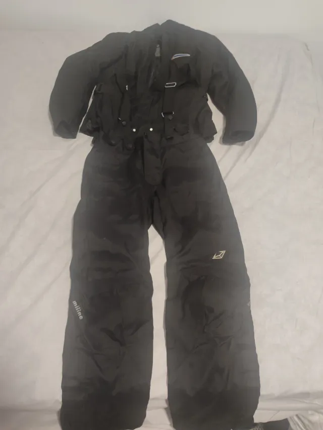Conjunto de chaqueta y pantalón de moto en color negro. - Chaqueta con múltiples bolsillos y tirantes. - Pantalón con logo en la pierna. - Marca: mlline