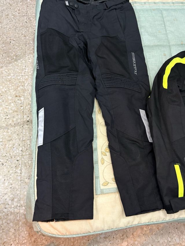 Detalles del productoConjunto de pantalón y chaqueta de moto en color negro. Diseñado para ofrecer protección y comodidad.