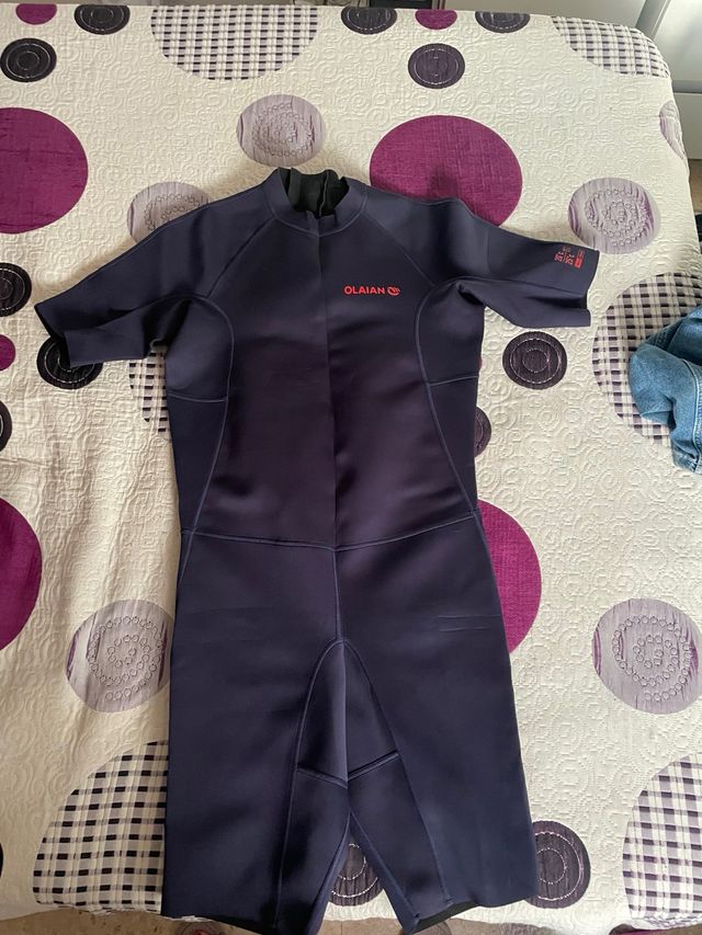 Traje de neopreno para buceo. - Color azul marino. - Cremallera frontal. - Mangas cortas y perneras hasta la rodilla.