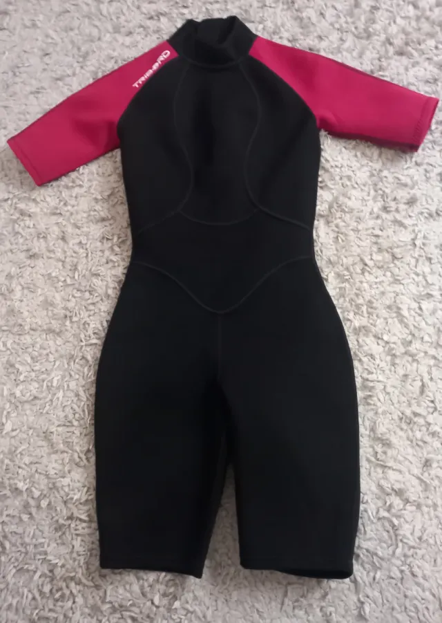 Detalles del productoTraje de neopreno corto de manga corta para mujer, ideal para deportes acuáticos. Combina negro y fucsia.