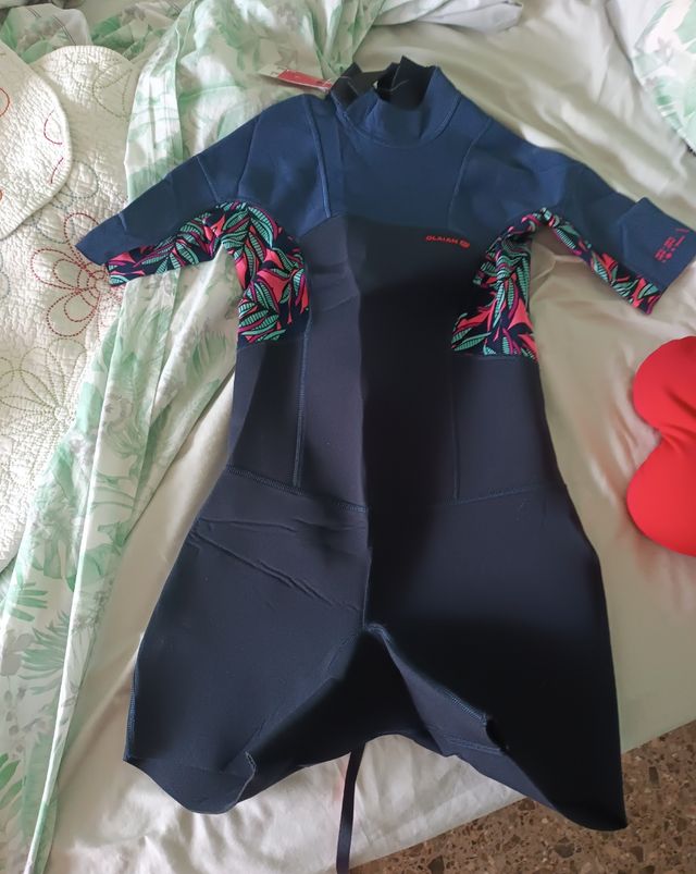 Traje de neopreno de manga corta con un diseño moderno. - Color azul marino. - Mangas con estampado tropical. - Cuello alto.