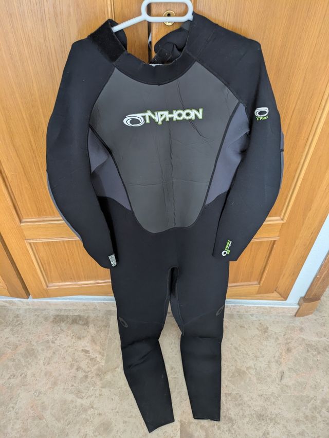 Traje de neopreno de la marca Typhoon, ideal para surf - Color negro y gris. - Logo de la marca en el pecho y en la manga. - Talla 37