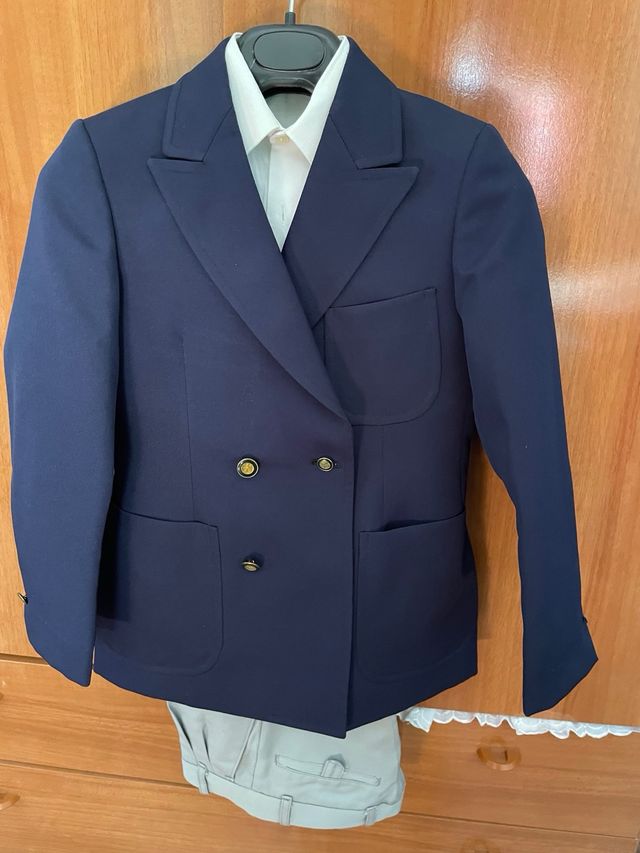 Chaqueta azul marino, pantalón gris claro y camisa blanca