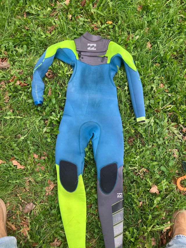 Traje de surf de neopreno para niño de la marca Billabong. - Color azul y verde lima. - Diseño de manga larga. - Paneles de protección en rodillas.