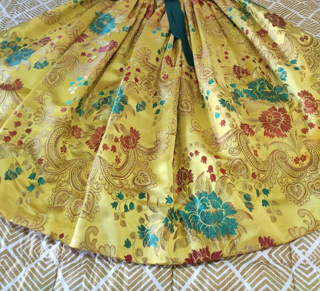 Se vende con manteletas, espardeñas forradas con la tela de la falda, mantilla (un uso). Confección artesanal. La fallera mide 1,65m. Recién lavado en tintorería tanto la falda como el corpiño.
