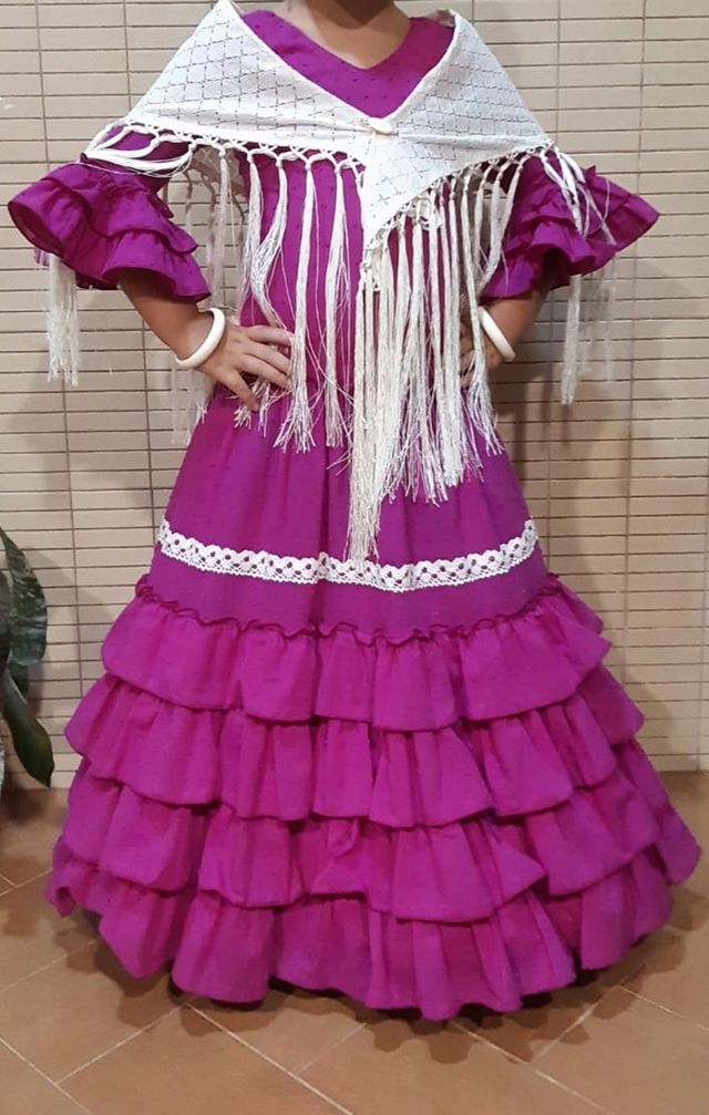 Traje flamenca Talla 6 color buganvilla con mantoncillo incluido. 30 cm de axila a axila aprox. 101 cm de largo aproximadamente.