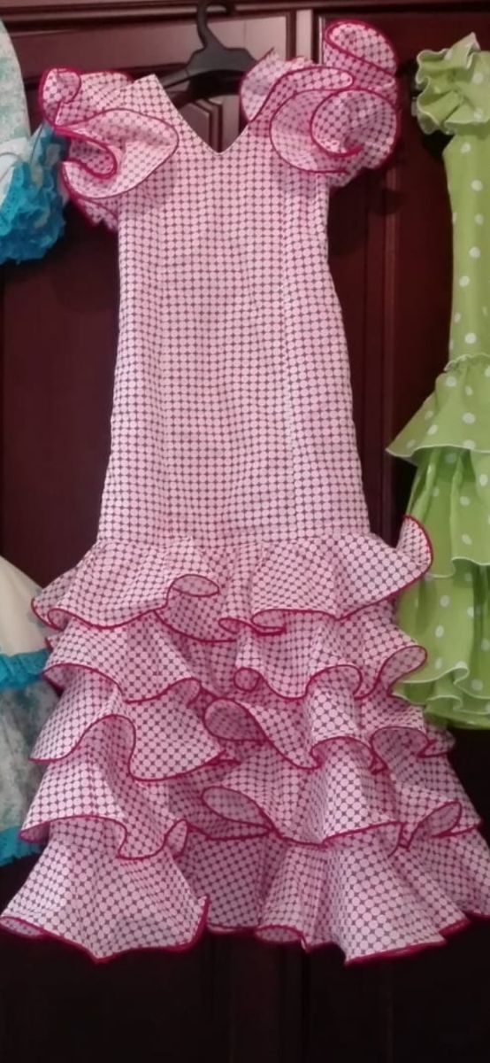 Traje de flamenca rosa de lunares, mide 1 metro y es de la talla 6.