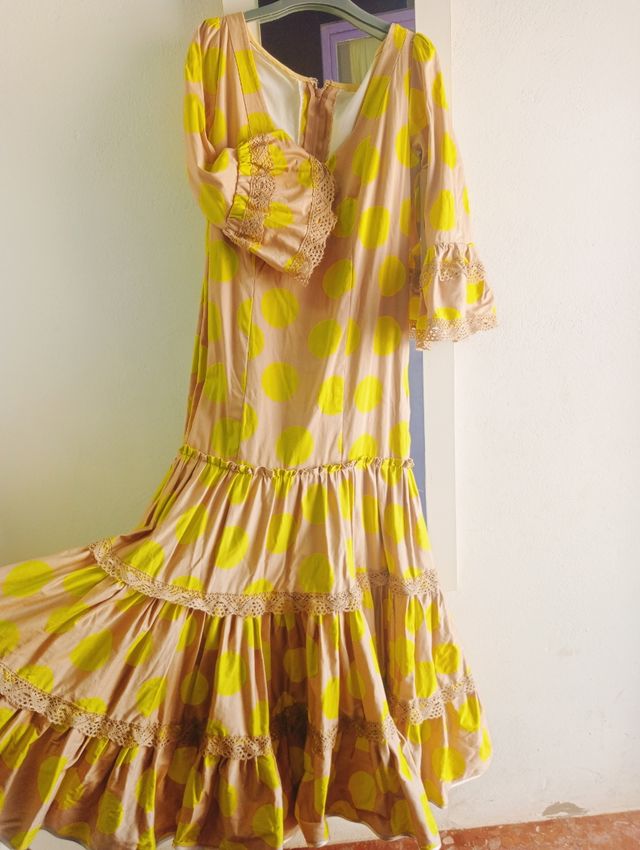 Traje Flamenca Beige y Amarillo Hecho a Mano