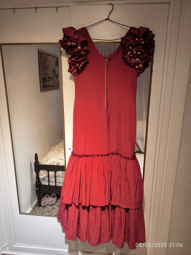 Precioso traje de flamenca, ideal para lucir en feras, romería y Rocio. Es de color rojo con lunares blancos.