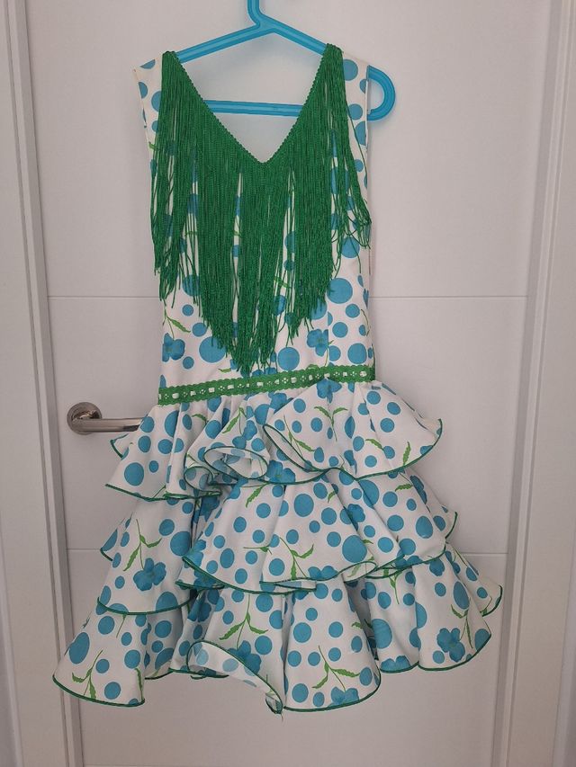 Traje gitana niña lunares azul blanco y verde. 12A