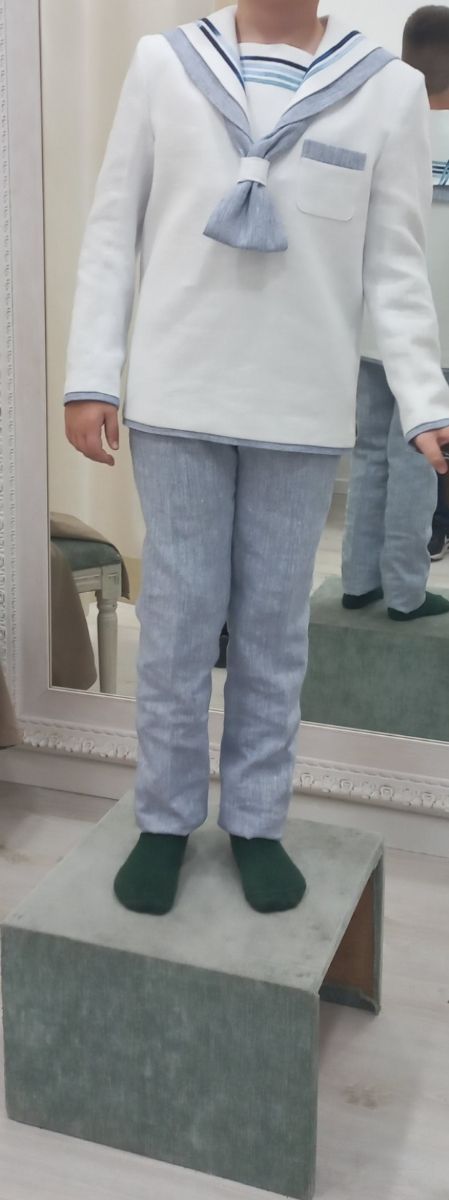 Traje de comunión talla 12 años,100% lino,el pantalón es azul jaspeado y la casaca es blanca con rayas en azul clarito y oscuro, el resto es azul jaspeado como el pantalón,el traje es de la temporada 2024,es más bonito que en foto, está impecable.