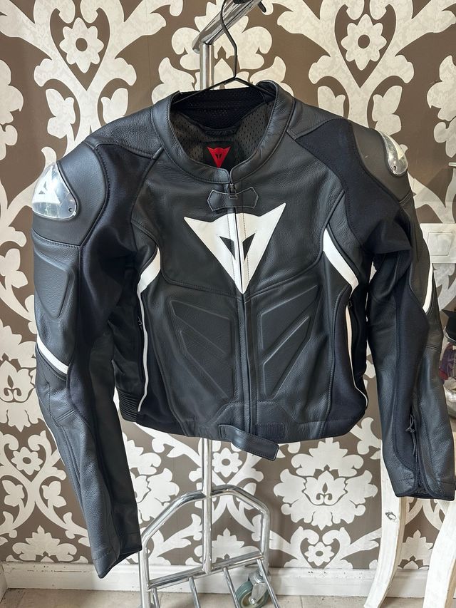Detalles del productoChaqueta y pantalón de moto Dainese de piel, completamente nuevos. -Piel de primera calidad. -Diseño deportivo. -Protecciones en codos, hombros y rodillas. -Cremalleras y cierres funcionales. -Color negro con detalles blancos.talla 54 2 piezas precio ALGO NEGOCIABLE atiendo por whatsapp al 646798639