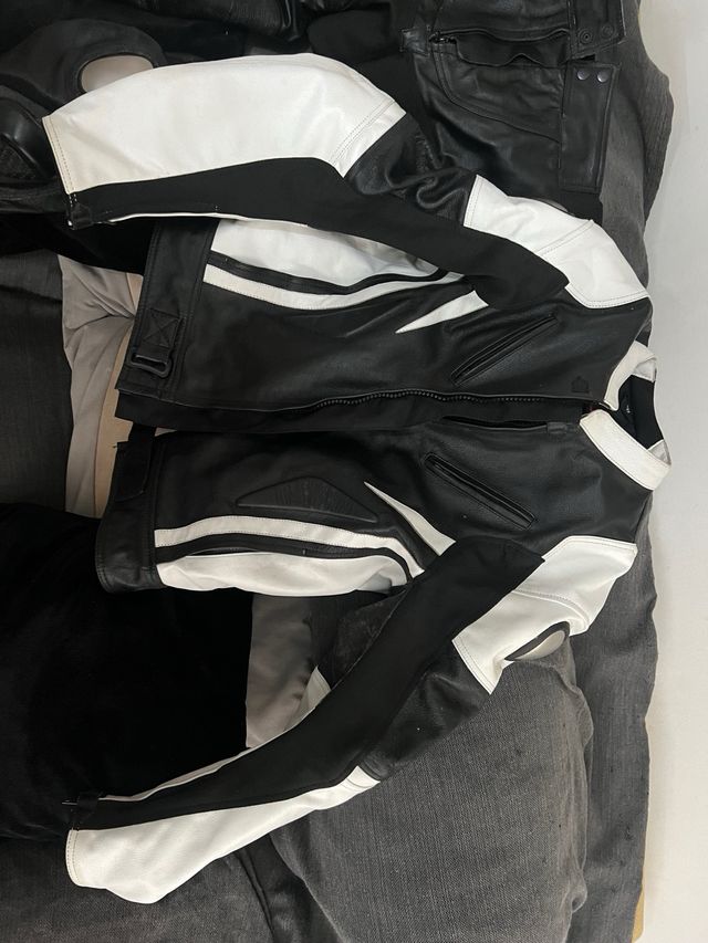 Detalles del productovendo traje de moto en cuero negro y blanco . se separa el pantalon de la chaqueta , lleva protecciones . es para chico talla m la chaqueta aunque en la etiqueta pone 3xl, esta adaptado . el pantalon es xomo una talla 42 , lleva goma en la cintura