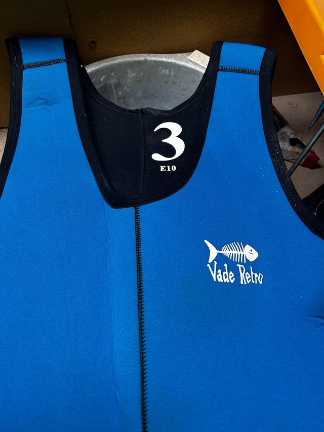 Traje de neopreno azul para barranquismo. - Talla 3. - Diseño con logo Vade Retro y pez esquelético. - Cremallera frontal.