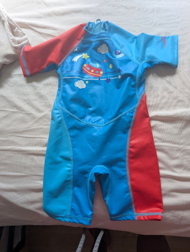 Detalles del productoTraje de neopreno para bebé de la marca Nabaiji, talla 12-18 meses. Es de color azul y rojo, con un diseño de temática espacial.