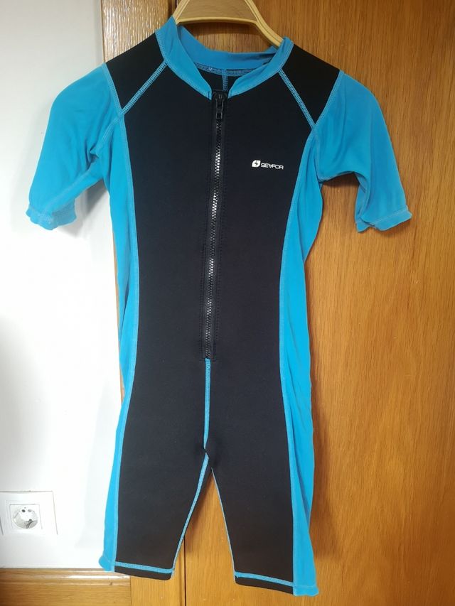 Traje de neopreno para niñ@, talla 10 años. - Color azul y negro. - Cremallera frontal. - Mangas cortas. - Perfecto estado.