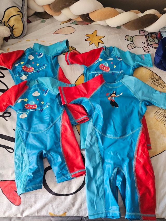 Detalles del productoTraje de neopreno para niño de Decathlon, ideal para actividades acuáticas. Es de color azul y rojo, con un diseño de temática espacial.