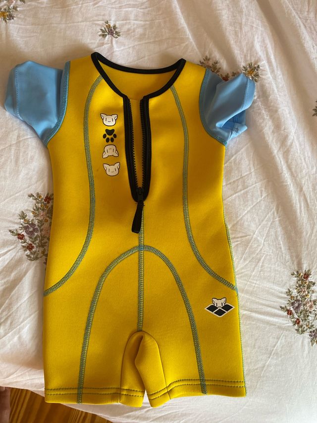 Detalles del productoTraje de neopreno para niños de la marca Arena, talla 1-2 años. Es de color amarillo con detalles azules y un divertido estampado de un gato surfeando.