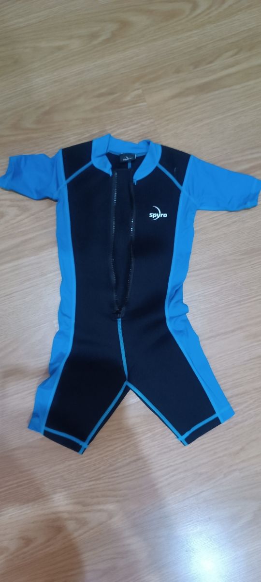 Detalles del productoTraje de neopreno para niño o niña, ideal para actividades acuáticas. Es de color azul y negro, y está en buen estado.