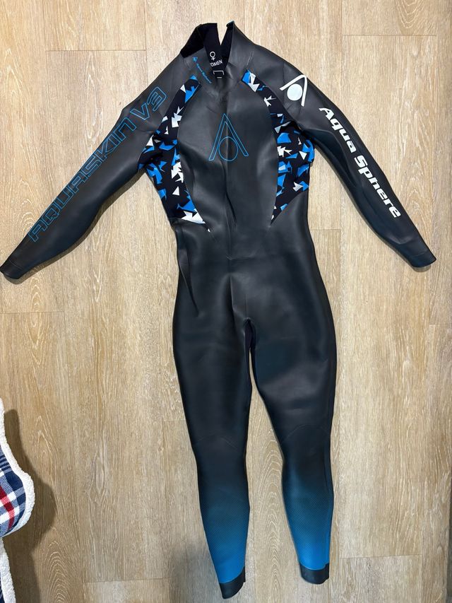 Traje de neopreno Aqua Sphere para triatlón. Talla M - Modelo Aquaskin V3. - Diseño con detalles en azul y blanco. - Mangas largas. - Piernas con degradado azul.