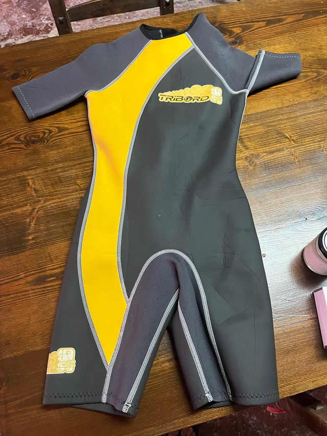 Traje de neopreno Tribord para niño, en muy buen estado. - Color gris y amarillo. - Talla niño 14 años - Neopreno corto, manga corta. - usado 3-4 veces