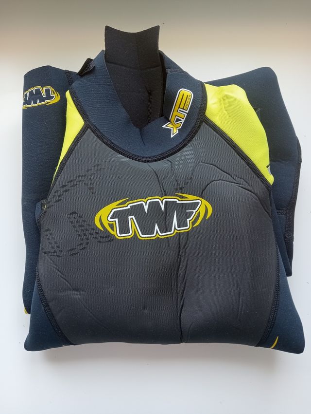 Traje de neopreno TWF para buceo y triatlón, en buen estado. - Marca: TWF - Talla K12 (niño/adolescente) - Color: Negro y amarillo neón - Diseño deportivo