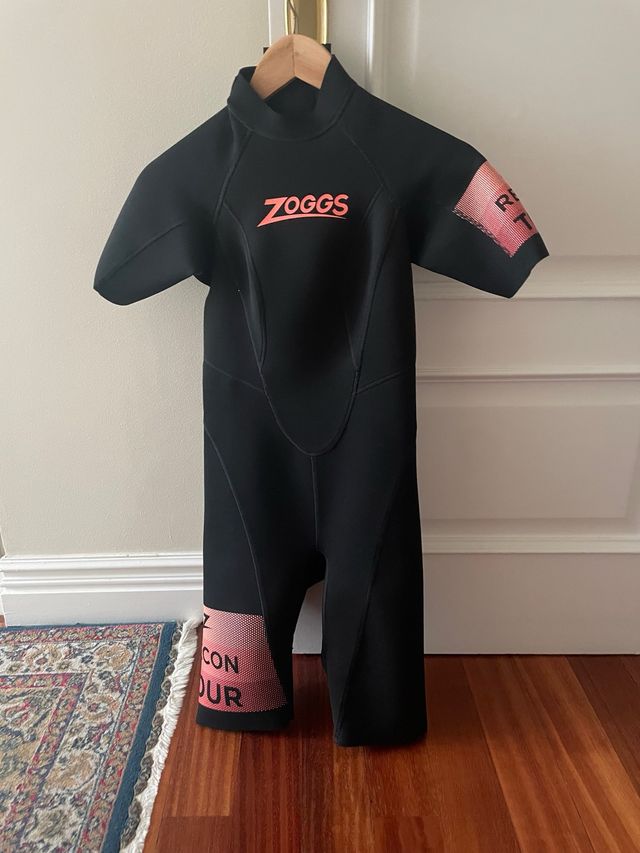 Traje de neopreno de la marca Zoggs. - Color negro. - Diseño de manga corta. - Detalle de banda rosa con texto en manga y pierna.