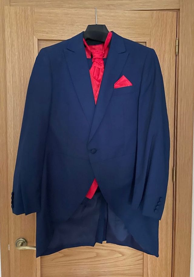 Combina estupendamente con chaleco, corbatín, pajarita, etc. de color azul cielo. Yo me casé de rojo, pero mi padrino llevó el mismo traje con los complementos en azul celeste.