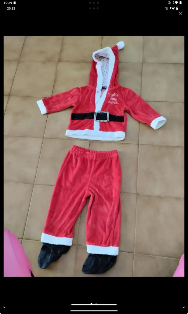 Conjunto de Papá Noel para bebé. En muy buen estado. - Talla 3/6 meses. - Incluye chaqueta con capucha y pantalón. - Material suave y cálido.