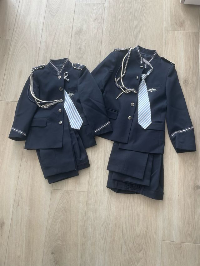 Conjunto de dos trajes de comunión Tizzas en color azul marino. - Chaqueta con detalles plateados. - Pantalón a juego. - Incluye corbata a rayas. precio individual