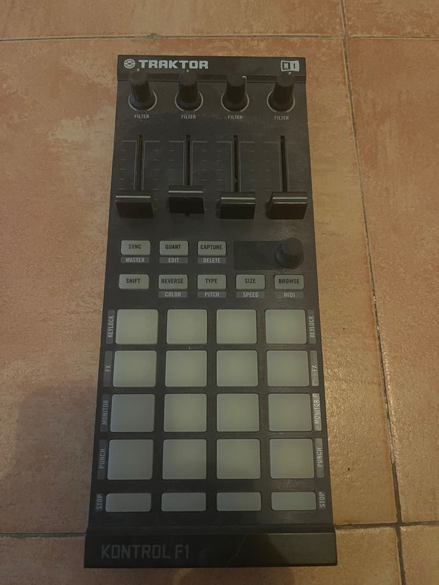 Controlador de DJ Traktor Kontrol F1. - Cuatro faders. - Cuatro perillas. - 16 pads. - Botones de función. Sin cable