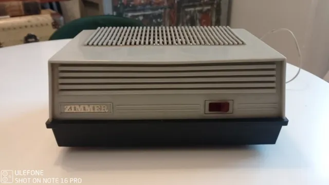 Detalles del productoTransformador de luz de la marca Zimmer. Diseño en color gris claro y base negra.