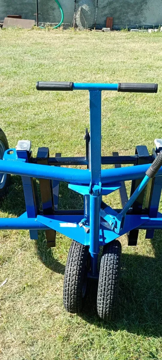 Detalles del productoTranspaleta robusta de color azul, diseñada para trabajos en obra.